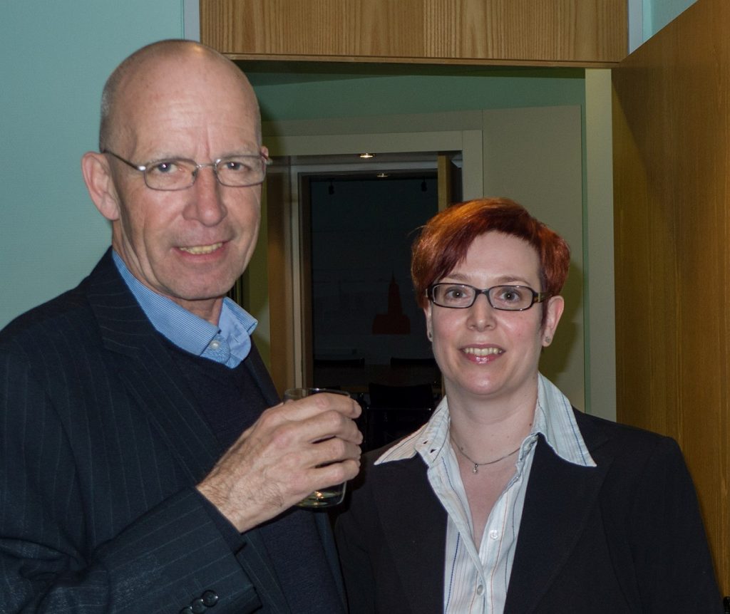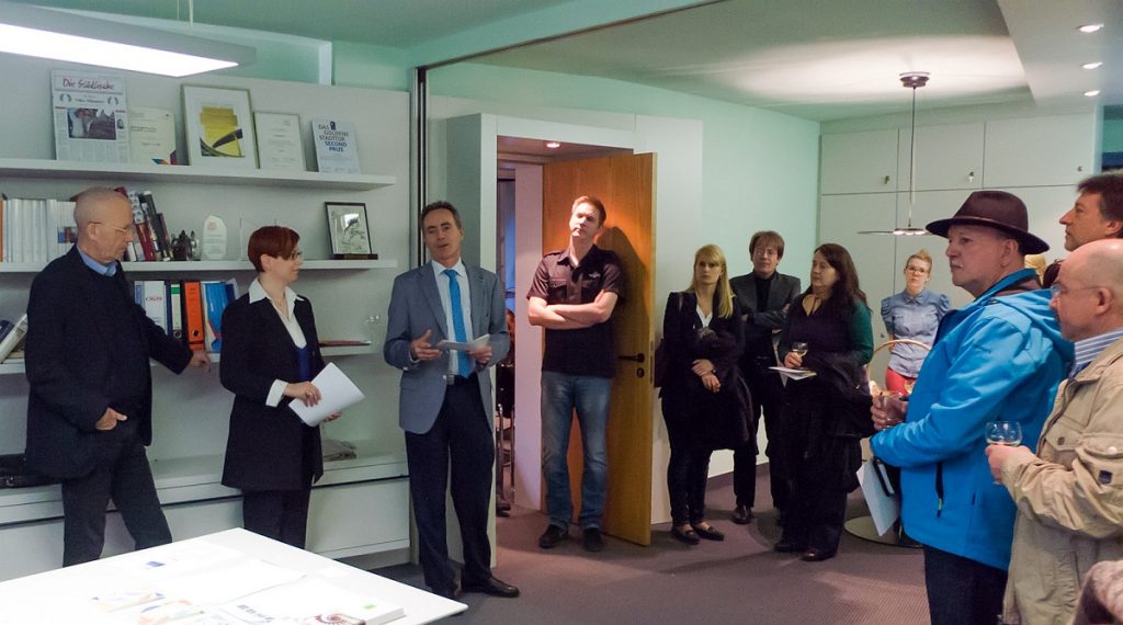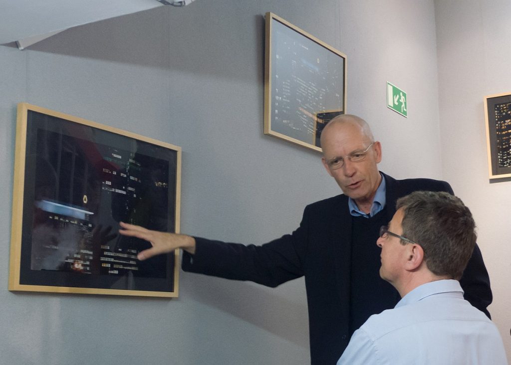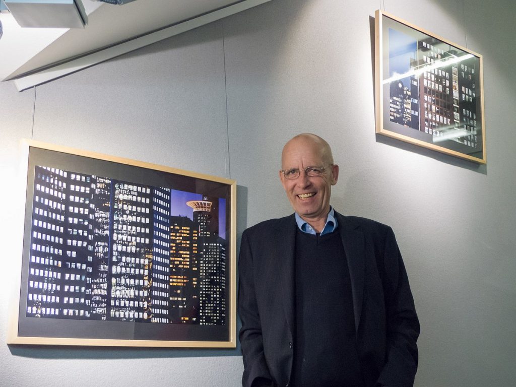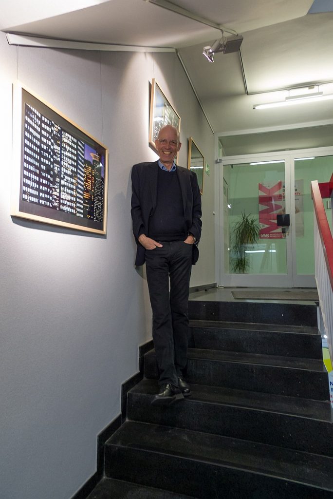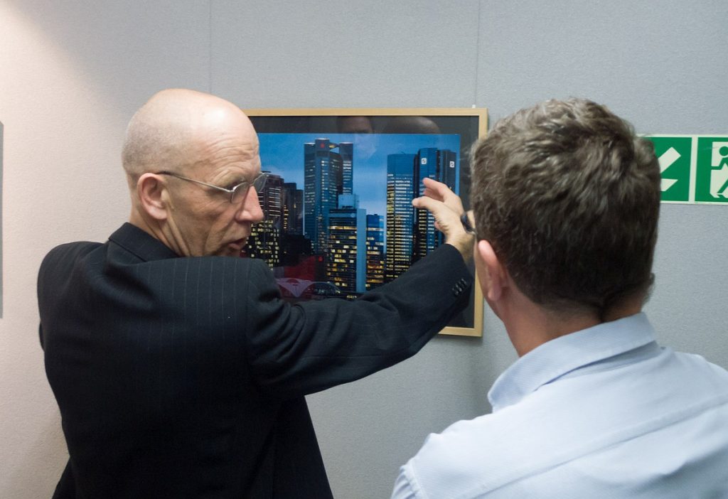 Bei einem Glas Wein führte der Fotograf im Anschluss durch die Ausstel­lung, die von unten nach oben den Bogen von der Stad­tan­sicht zur Detailauf­nahme span­nt. Erich Mehrl wählte dabei meist die Per­spek­tive von Däch­ern und oft nicht öffentlich zugänglichen, höher gele­ge­nen Stand­punk­ten. Er bietet so Ansicht­en von Frank­furt, die man als Fußgänger nicht wahrnehmen kann. Der freis­chaf­fende Foto­jour­nal­ist und Bil­dredak­teur wid­met sich seit vie­len Jahren der mod­er­nen Frank­furter Architek­tur. Auf sein­er Web­site Archiv Mehrl find­et sich eine Auswahl sein­er Arbeit­en, die neben dem Banken­vier­tel ins­beson­dere das IG Far­ben-Haus im Wes­t­end beinhaltet.