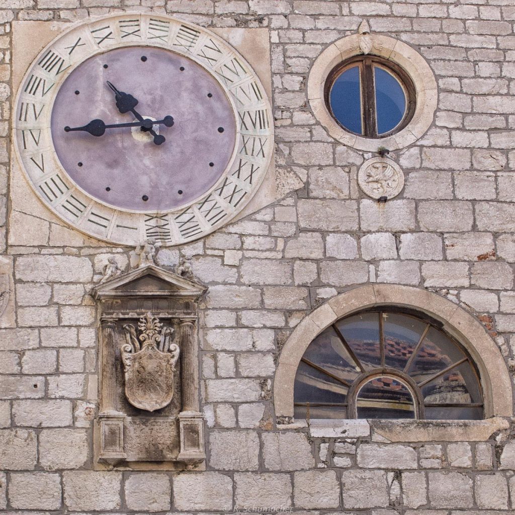 Zeit fotografisch zu erfassen ist durchaus eine Herausforderung, der wir uns in unserem letzten Kalenderprojekt stellten. Als erstes fallen einem sicherlich die Fotografie von Uhren und Uhrwerken ein. Als Beispiel habe ich mal ein Motiv aus dem kroatischen Sibenik gewählt, eine historische 24h-Uhr.
