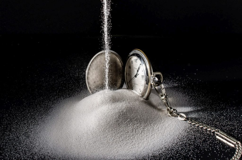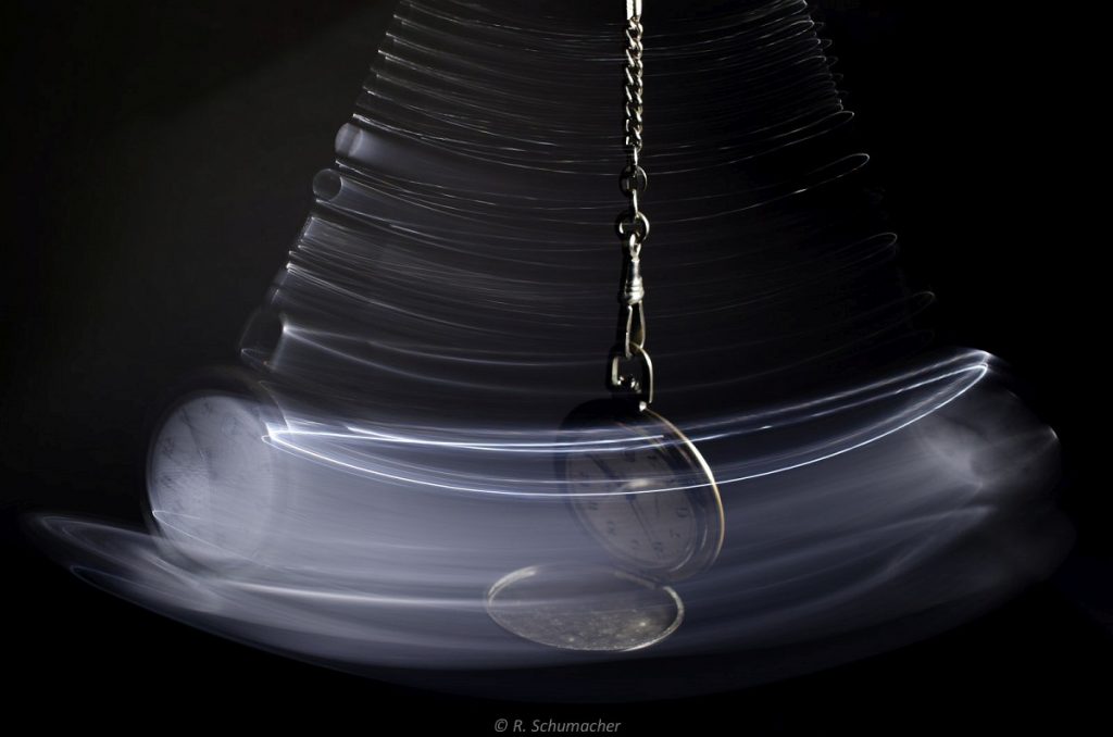 Als nächste Assoziation kommt sicherlich auch der Begriff “Bewegung”. Kombiniert man dies mit einer Taschenuhr, kommt eine Aufnahme einer pendelnden Uhr heraus, die mit Langzeit-Synchronisation (zweiter Verschlussvorhang) aufgenommen wurde. Zur Beleuchtung kam eine LED-Taschenlampe und ein entfesselter Systemblitz zum Einsatz.