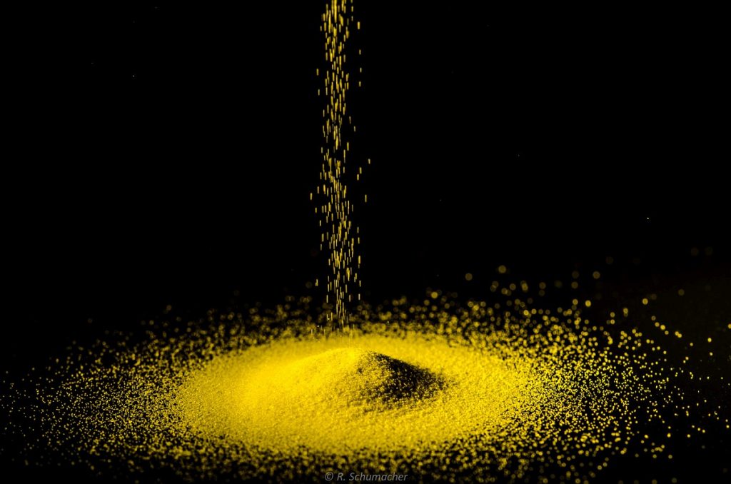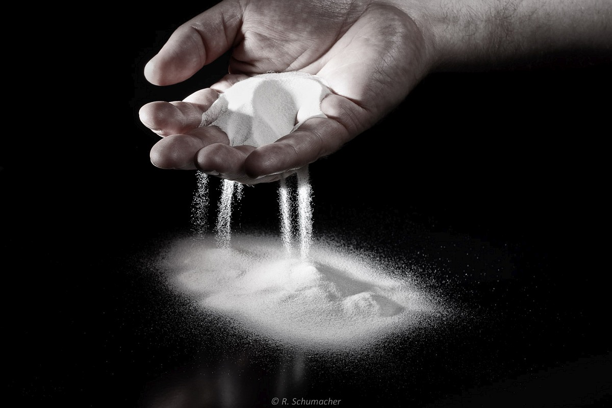 Rieselnder Sand (weißer Dekosand aus dem Baumarkt) war letzlich aber das ergiebigste Thema meiner Tabletop-Projektes. Auch hier wurde mit entfesselten Systemblitzen gearbeitet, teilweise mit gelber Farbfolie.
